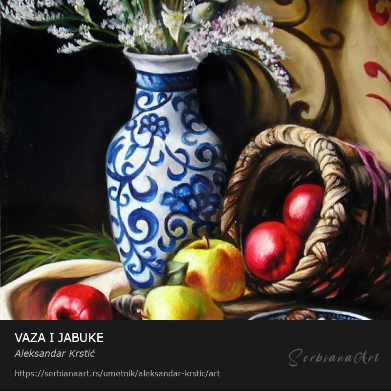 Ulje na platnu \\\"VAZA I JABUKE\\\\\\\" 70cm x 60cm. Može i uramljivanje po želji. Moje slike se nalaze u mnogim privatnim kolekcijama u zemlji i inostranstvu. SLIKA JE JOŠ LEPŠA UŽIVO, TREBA JE DOŽIVETI! ! ! * Autor slike: dip.diz.master Aleksandar Krstić * Naziv slike: VAZA I JABUKE * Veličina slike: 70cm x 60cm * Tehnika: Ulje na platnu - REALIZAM SVE MOJE SLIKE SU RAĐENE PRVOKLASNIM ULJANIM BOJAMA, KOJE GARANTUJU POSTOJANOST I DUGOTRAJNOST, NA PROFESIONALNO PRIPREMLJENOM PLATNU! Kupljenu sliku šaljem kurirskim službama PostExpress, CityExpress, AKS. . .Podelite i promovišite ovo delo