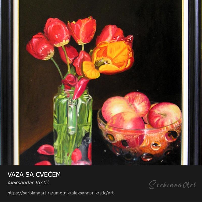 Prelepa slika koja pleni svojom lepotom, ne može proći ne zapaženo. Ulje na platnu ``VAZA SA CVEĆEM`` 80x60cm, uramljena kvalitetnim ramom. SLIKA JE JOŠ LEPŠA UŽIVO!!! * Autor slike: Graf.diz.mr.Aleksandar Krstić * Naziv slike: ``VAZA SA CVEĆEM`` * Veličina slike: 80cm x 60cm (uramljena) * Tehnika: Ulje na platnu SVE MOJE SLIKE SU RAĐENE PRVOKLASNIM ULJANIM BOJAMA, KOJE GARANTUJU POSTOJANOST I DUGOTRAJNOST, NA PROFESIONALNO PRIPREMLJENOM PLATNU!Podelite i promovišite ovo delo