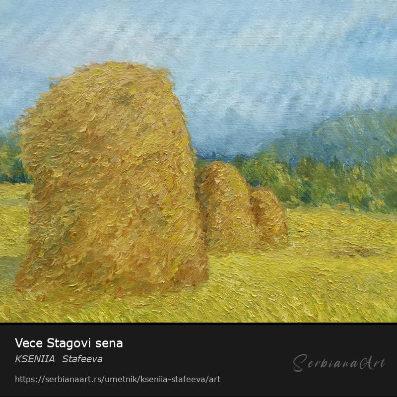 Odrastao sam u selu među lepim njivama, livadama, šumama i planinama. Avgust sam proveo sa ocem koseći seno. Zlatni plastovi sena bili su simbol uspešne žetve, simbol rada i plodnosti zemlje. Prenosim vam zlato žetve kao simbol uspeha kroz ovu sliku "Veče. Plagovi sena"