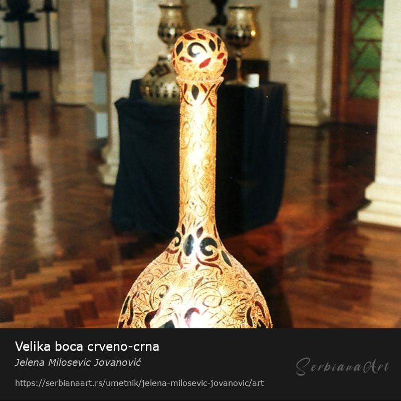 Velika boca crveno-crna, visina 80cm, rucno duvano i slikano staklo.Podelite i promovišite ovo delo