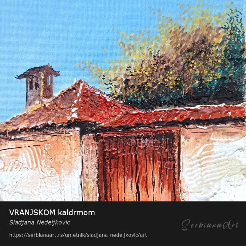 Zidovi obojeni zubom vremena, crvena kapija što ćuti priče prošlosti, i krov iznad koga granje treperi na vetru – svaki potez četkice prenosi osećaj doma, mira i sećanja.