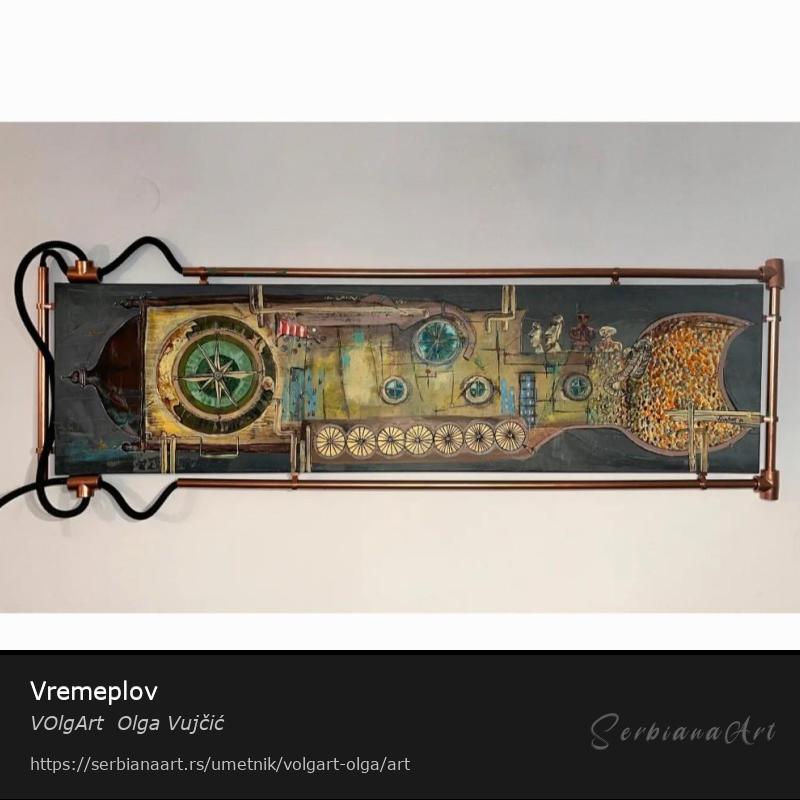 Kao umetnica ovog dela, „Vremeplov“, stvorila sam spoj prošlosti, budućnosti i mitoloških kultura kroz jedinstvenu kompoziciju elemenata. Voz je simbol putovanja kroz vreme, a njegova kupola u obliku starinskog sata, zamenjena kompasom, ukazuje na navigaciju ne samo kroz prostor, već i kroz dimenzije prošlih civilizacija. Prozori u stilu podmornice prikazuju unutrašnji svet ove mašine, podsećajući na dubinu vremena, dok riblji rep simbolizuje povezanost sa prirodnim i morskim svetom.
