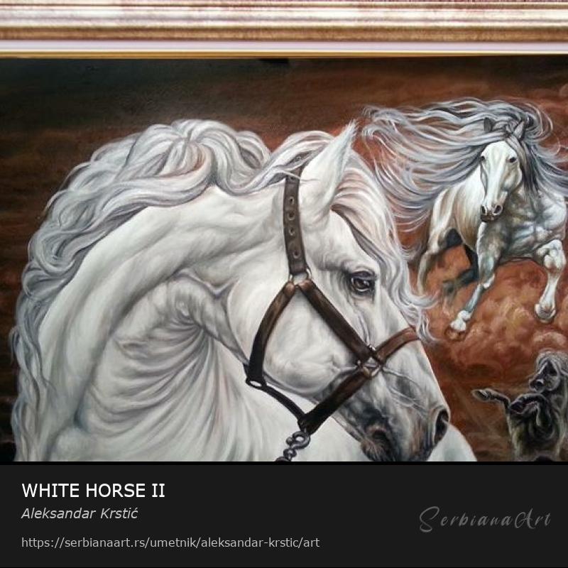 Slika je rađena po narudžbini. * Autor slike: Aleksandar Krstić dipl. prim. umetnik-master * Naziv slike: WHITE HORSE II * Veličina slike: 90 x 70cm (uramljena) * Tehnika: Ulje na platnu (REALIZAM) SVE MOJE SLIKE SU RAĐENE PRVOKLASNIM ULJANIM BOJAMA, KOJE GARANTUJU POSTOJANOST I DUGOTRAJNOST, NA PROFESIONALNO PRIPREMLJENOM PLATNU!Podelite i promovišite ovo delo
