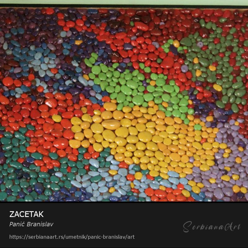 Radjen je tehnikom lepljenja sitnih obojenih oblutaka na sper plocu.Podelite i promovišite ovo delo