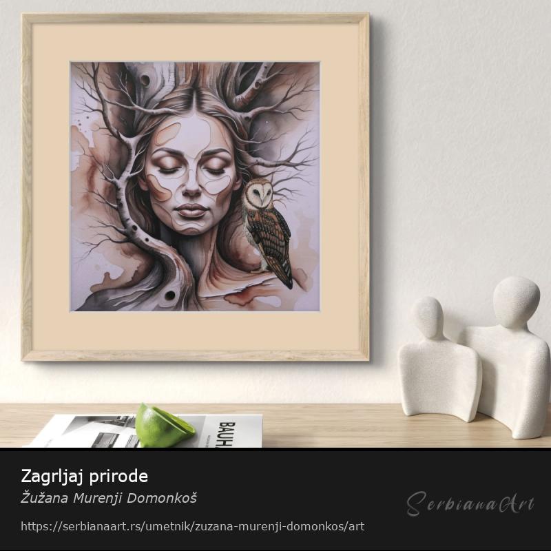 Ovo umetničko delo predstavlja zadivljujuću vizuelnu interpretaciju veze između prirode i čovečanstva, kao da koreni drveta prožimaju ne samo zemlju već i naše duše. Organsko preplitanje ženskog lica i grana jasno ukazuje na to da ljudi ne samo što žive u prirodi, već su njen nerazdvojni deo – čak i kada na to zaboravimo. Sova, simbol mudrosti i tihe budnosti, kao da tiho poručuje: „Obrati pažnju, jer priroda nikada ne ćuti.” Mekani tonovi zemljanih boja donose osećaj mira i harmonije koje samo priroda može pružiti, dok složeni detalji pričaju dublju priču. Zatvorene oči naglašavaju značaj unutrašnjih putovanja, podsećajući nas da priroda nije samo oko nas, već i u nama. Ovo umetničko delo predstavlja svet u kojem granica između ljudi i prirode nestaje, pokazujući kako su sva živa bića deo šireg, povezanog sistema. Jedan pogled na ovu kompoziciju dovoljan je da shvatimo: možda prirodu ne štitimo mi, već nas ona održava u životu. Svaki potez, svaki detalj, podseća nas da je mudrost prirode uvek s nama – samo treba da se umirimo i oslušnemo je.