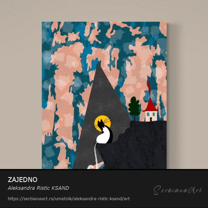 "Zajedno" dočarava duboku povezanost dve duše, simbolizovanu crnom i belom mačkom koje sede blizu jedna druge, sa neraskidivom vezom. Iznad njih, sivi trougao obuhvata sunce, predstavljajući međusobnu povezanost života i kosmosa. Trougao, bezvremenski simbol harmonije i balansa, podseća nas da je sve—ljubav, priroda i univerzum—duboko isprepleteno.