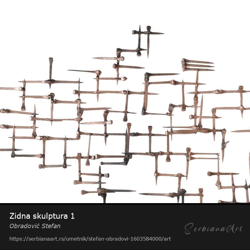 Zidna skulptura od metala dimenzija 36cm x 60cm sa pojedinim delovima udaljenim 6cm od ravni skulpture koja se postavlja na zid. Autor Stefan Obradović predstavnik marginalne umetnosti. Rad nastao 2020. godine.Podelite i promovišite ovo delo