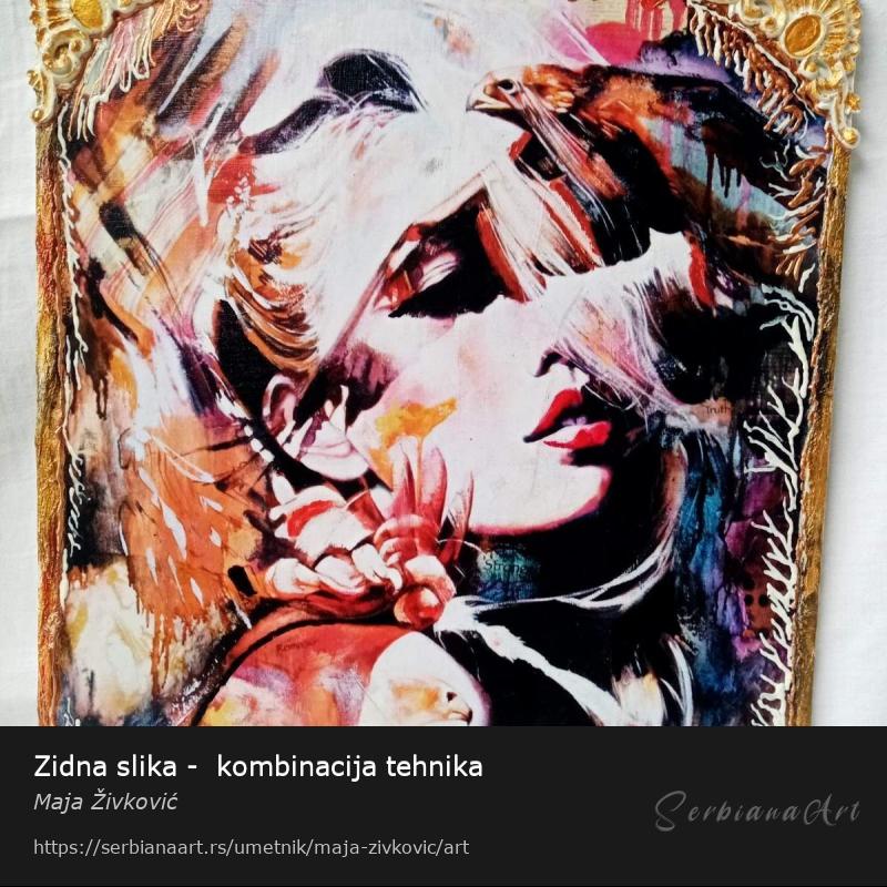 Osnova slike rađena je dekupaž tehnikom a "nadograđena" je slikanjem i kontur pastama kao i osušenim ornamentima silikona na ivicama.