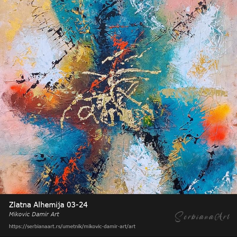 Opis: Otkrijte magiju i energiju kroz umetničko delo "Zlatna Alhemija". Ova apstraktna slika, izrađena kombinacijom akrilnih i uljanih boja, obogaćena listićima pozlate, odiše dubokom simbolikom i živopisnim tonovima. Smeštena na platnu, slika prikazuje dinamičan splet boja koje se prepliću u harmoničnom haosu.