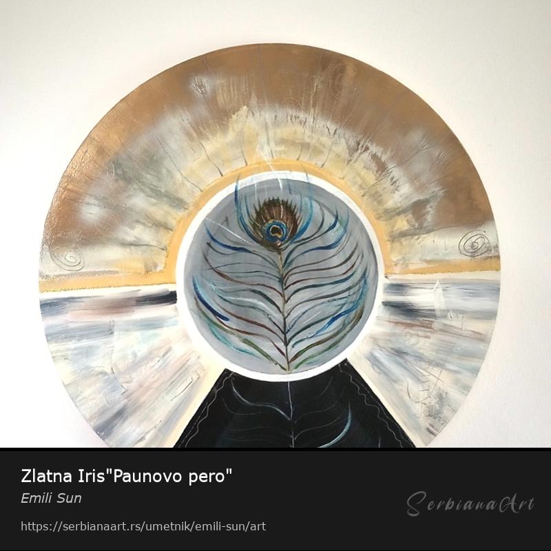 Golden Iris "Peacock Feather" Abstraction, acrylic technique on a circular canvas, diameter 60cm Description: In the center of the golden iris is a peacock feather, which in all cultures and according to the Feng Shui principle is a symbol of peace, wisdom, graceful beauty, reputation and prosperity. The peacock feather itself has 7 basic colors as well as the rainbow. It symbolizes the perfect golden section that nature creates and man follows in many projects and modern architecture. Like the sun that attracts love and joy, it clears the space of unfavorable energies. Also inspire the brightest sparks hidden in the heart.Podelite i promovišite ovo delo