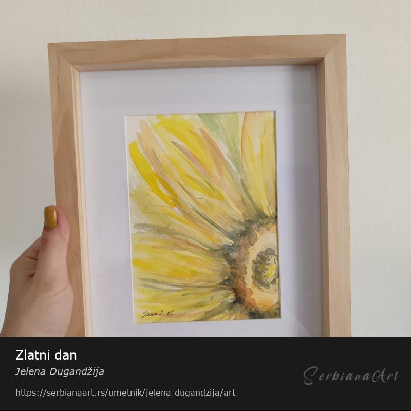 Slika "Zlatni dan" je deo kolekcije inspirisane letom i suncokretima. Sve su uramljene fabričkim ramom, zastakljene i radjene na profesionalnom papiru, profesionalnim akvarel bojama.