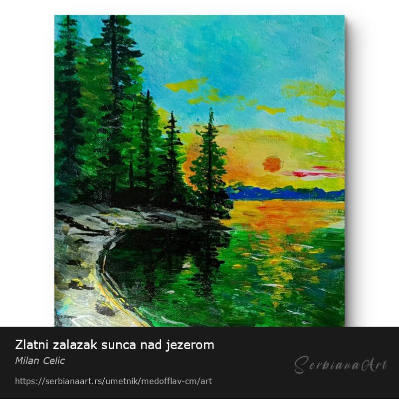 Ova očaravajuća slika prikazuje idiličnu jezersku obalu okruženu gustim borovima, gdje se zalazak sunca razliva u spektakularnu paletu narančastih, žutih i crvenih tonova, odražavajući se na mirnoj vodi poput zlatnog ogledala. Nebo, obojano u živahne plave nijanse s nagovještajima oblaka, dodaje dramatičan kontrast zelenilu stabala i kamenitoj obali. Naslikana akrilnim bojama, slika odiše toplinom i spokojem, hvatajući trenutak prirodne ljepote koji inspirira i smiruje. Savršena za ljubitelje prirode i umjetnosti!