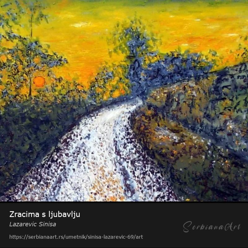 Slika "Zracima s ljubavlju"je ulje na platnu dimenzija 60x50cm.Prikazuje put koji se proteže kroz prirodu dok Sunce zalazi u pozadini,stvarajući zlatno nebo.Rastinje je prikazano u toplim tonovima smeđe i zelene boje,a Sunce je prikazano u nijansama žute i narandžaste.Put se proteže kroz sredinu slike,pružajući gledaocu osećaj dubine i perspektive.Atmosfera slike je topla i mirna,pružajući osećaj smirenosti i opuštanja.Orginal slikaslika sa potpisom kupujete od autora.