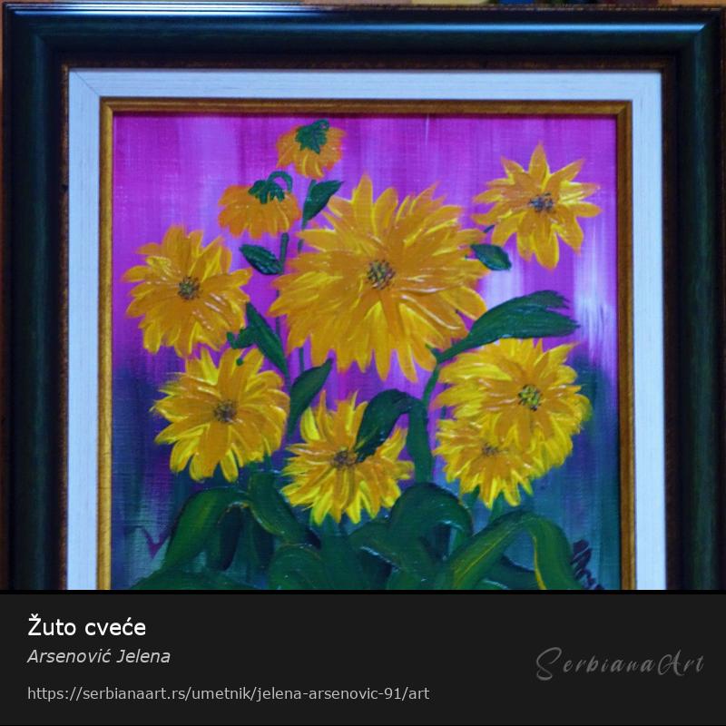 * Žuto cveće * 28 k 28 cm sa okvirom *20k20 cm slika *akril na pamučnom platnu * 80 € #jars21 Žuta Osnovna simbolika žute je Sunce, život i radost, a povezuje se i sa izrazom kreativnosti, zaštite, intelekta, pozitivnosti i čistoće. Koristite žutu da: podržite svoju unutrašnju viziju, poboljšate samopouzdanje i komunikaciju